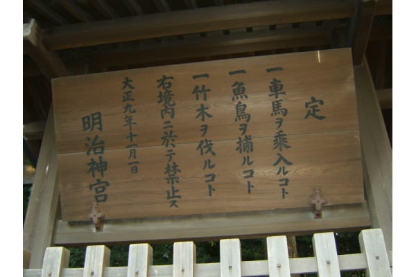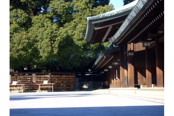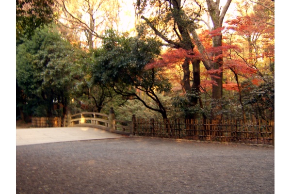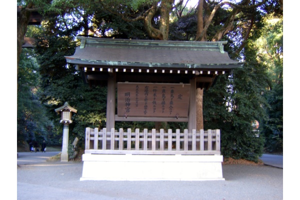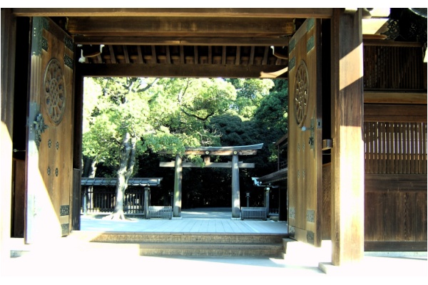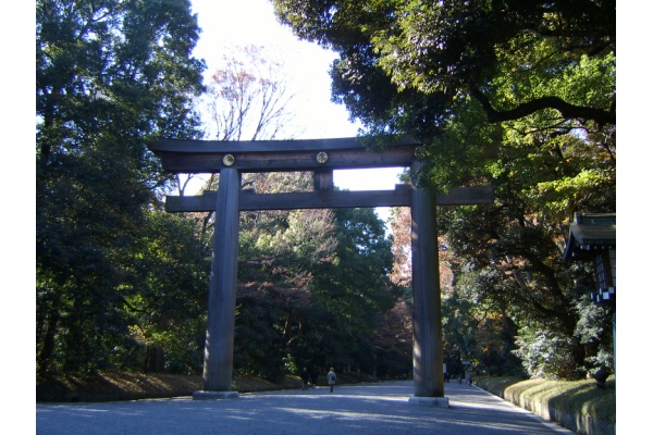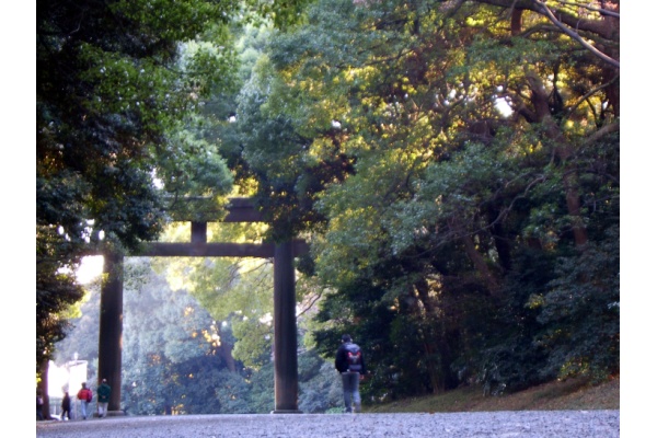 Main Tori into the Meji Shrine. The Meji Emporer was the Emperor who was responsible for much of the modernization of the Japan and the end of the Samuri as a class. The Tori indicates this is a Shinto shrine.