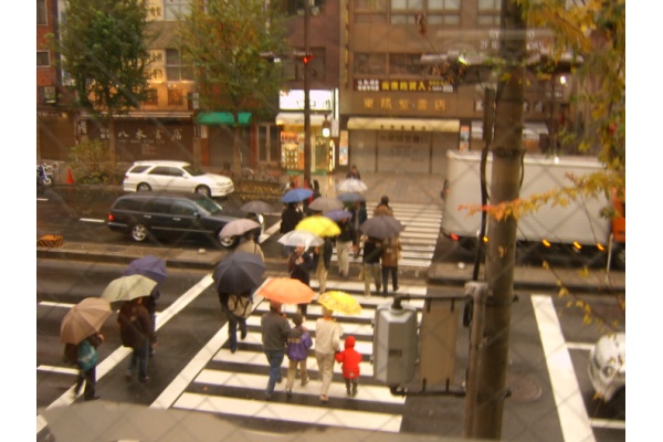 View from within Starbucks. I had Katsudon in the little shop accross the street. You buy a ticket at the vending machine outside the shop and take it inside, then the cook fixes it. The cook asked me something and that I couldn't quite understand. I shrugged my sholder and he replied something about "abunai desu." I knew this translates to Dangerous, so I was a bit nervous. The food was Excellent though!